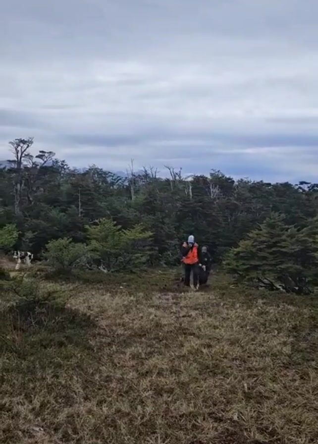 A person wearing an orange vest walks with two dogs across a grassy field, towards the camera. The dogs are on leashes, held by the person. Beyond the field is a line of trees. The sky is overcast.