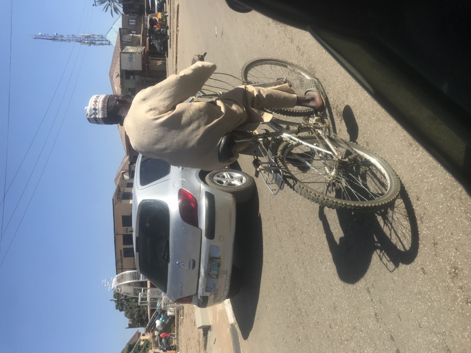 A man rides a bicycle on an urban street. He wears a tan outfit and a patterned white cap. A silver Peugeot car is parked on the side of the road. A transmission tower stands in the background amidst buildings. The shadows of the bicycle and rider are visible on the asphalt.