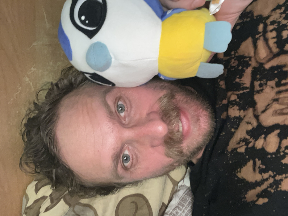 A man with light eyes and wavy brown hair is lying on a patterned pillow. He has a beard and is wearing a black shirt. A plush toy of a bird-like character with large eyes, primarily white and blue, is positioned on his forehead. The background appears to be a bed with a bleached-looking black and beige duvet or blanket. The image is taken from a close, slightly downward angle, focusing on the man's face and the plush toy.