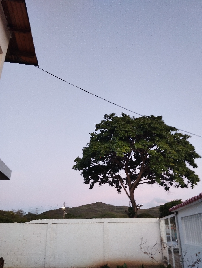 A tree dominates the scene, its lush canopy extending over a white concrete wall. A building's eaves are visible in the upper left corner, with a taut black cable stretching across the sky. Distant rolling hills and a utility pole punctuate the horizon. Part of a white building is to the right side. The sky is a soft gradient of pale blue and pink, suggesting dawn or dusk.