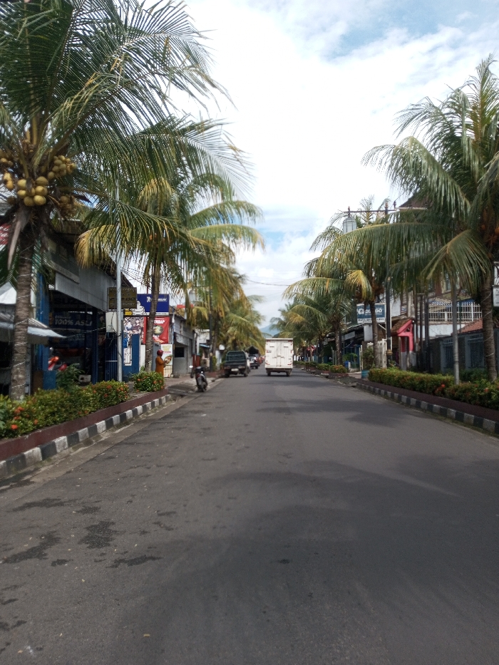 This image captures a street scene in Chagzam_Pam, Bhutan, observed during daytime under a partly cloudy sky. An asphalt road, exhibiting various patches and marks, extends from the foreground toward the background. It is bordered on both sides by concrete curbs with alternating black and white stripes. Immediately behind these curbs are raised planters containing green shrubbery and clusters of small red-orange flowers. Tall palm trees, specifically coconut palms with green coconuts visible on the tree in the immediate left foreground, line both sides of the street. Buildings, varying in height from single-story shops with visible signage (including "100% ASLI") to multi-story structures, form continuous facades behind the vegetation. On the left side of the street, a person wearing an orange top stands near one of the buildings. A white scooter is parked along the left curb. Further down the road on the left, a dark-colored pickup truck is visible. On the right side, another white enclosed delivery truck is seen heading away from the viewer. Mountains are discernible in the distant background, partially obscured by atmospheric conditions.