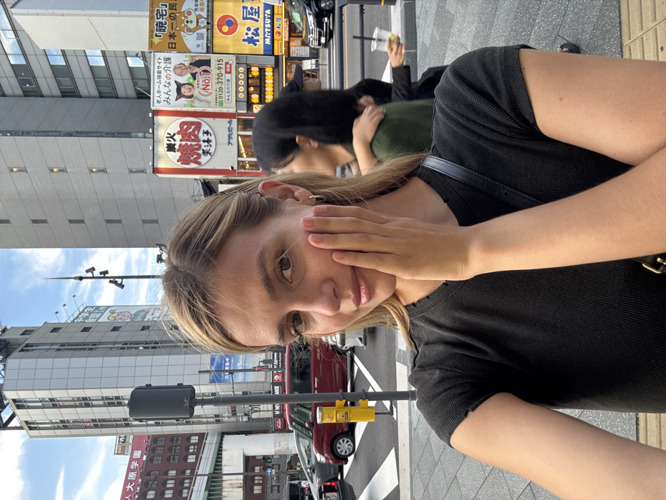 An urban street scene in Osaka, Japan, is depicted during daylight hours with a clear sky. In the foreground, a young adult female with fair complexion and light brown hair, pulled back, faces the camera for a selfie. She wears a dark grey ribbed short-sleeved t-shirt with distressed edges and small silver hoop earrings. Her right hand is open, resting against her right cheek, and her lips are slightly parted. A black shoulder strap is visible on her left side. Behind her, to the right, two individuals walk away from the camera. One person, wearing a dark green long-sleeved top and dark hair, has an arm around the shoulder of the other. The second person, mostly obscured, holds a clear plastic cup containing a light green beverage with a straw. The background features a busy city street with vehicular traffic, including a red compact car stopped at a pedestrian crossing on the left. The sidewalk has grey patterned paving and white crosswalk markings. A black utility pole with a yellow pedestrian crossing button is prominent on the left. Multiple multi-story buildings line the street, including a modern grey high-rise with vertical windows on the right and a red-brick-like building on the far left bearing the sign "大阪大学" (Osaka University). Numerous large Japanese commercial signs are visible, including "焼肉" (Yakiniku) with the Asahi Beer logo, a billboard for senior care services, and the distinct orange and yellow logo of "松屋" (Matsuya), a restaurant chain. Another sign advertises "宅地建物取引士" (Real Estate Transaction Specialist).