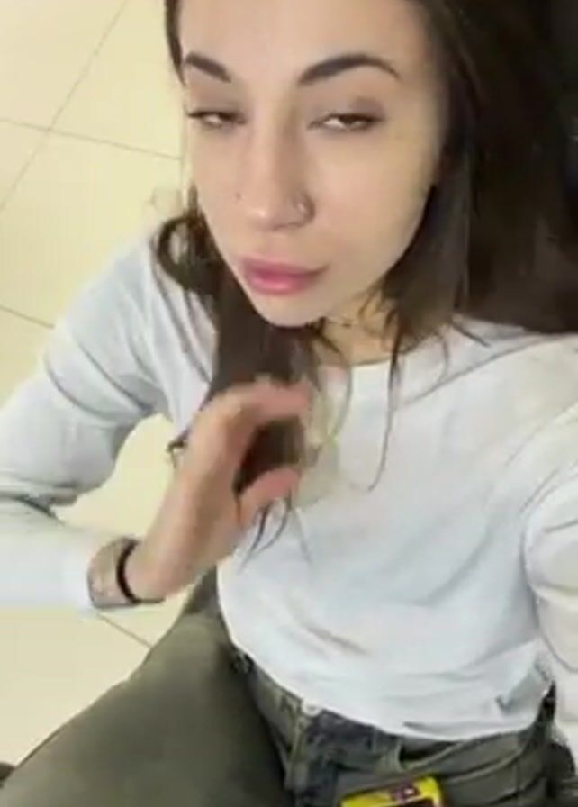 The video features a woman with long, dark brown hair and fair skin sitting in what appears to be a tattoo parlor or similar establishment. She is wearing a white, long-sleeved shirt and grey jeans. She has a nose ring in her left nostril and visible tattoos on her left arm and collarbone area. The woman looks directly at the camera for most of the video, occasionally touching her hair and adjusting her shirt. The background suggests she is in a room with tiled floors, and there is a covered tattoo chair visible behind her. She appears to be recording a video of herself. There's a pink object clipped to her jeans.