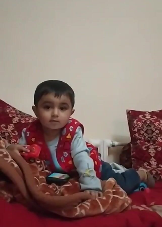 A young child lies on a red patterned bed, propped up on their arms. They are wearing a blue shirt, jeans, and a red vest with floral patterns. A smartphone is on the bed near them, and they are holding a green toy car in their right hand. A brown blanket is partially covering the bed. There are two red patterned pillows behind the child. The wall behind the bed is plain white. The child looks directly at the camera. The child then looks down at their lap.