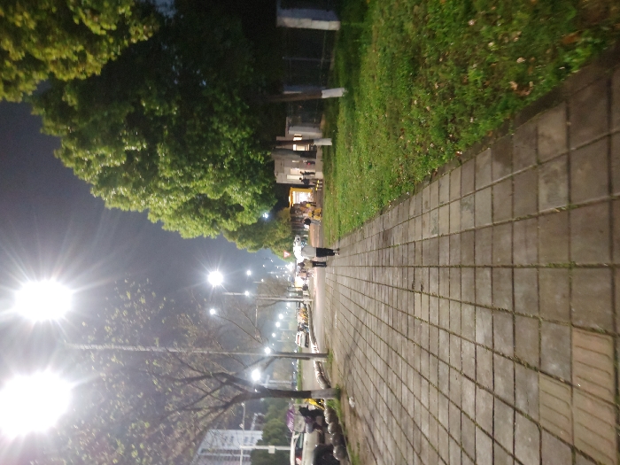 The image depicts an urban street scene at night, illuminated by numerous bright artificial lights. The setting is identified as the Chongqing High-tech Zone, China. In the foreground and extending into the midground, a wide pedestrian sidewalk constructed from rectangular and square grey-toned paving slabs dominates the lower portion of the frame. The paving shows some minor discoloration and surface wear. To the left of the sidewalk, a paved road runs parallel, occupied by several parked or moving vehicles, including a visible white sedan and a vehicle with purple accents. A row of trees with sparse foliage lines the left side of the road, punctuated by multiple tall streetlights emitting intense, starburst-like flares against the dark night sky. A large, multi-story building is partially visible in the far background on the left. To the right of the sidewalk, a strip of green grass approximately 1-2 meters wide separates the pedestrian path from a dense row of mature trees featuring vibrant green, broadleaf foliage. Several tree trunks within this row are painted white at their base. Beyond these trees, an indistinct fence or barrier is present, alongside small, illuminated structures resembling kiosks or shops, around which several additional figures are gathered. At least five individuals are discernible within the scene. In the midground on the sidewalk, two individuals are walking away from the camera: one wearing a light-colored top and dark pants, positioned slightly ahead, and another in darker attire to their left. Further down the sidewalk and clustered near the illuminated structures on the right, additional indistinct figures are present, indicating pedestrian activity. The sky above is dark, consistent with a nighttime environment.