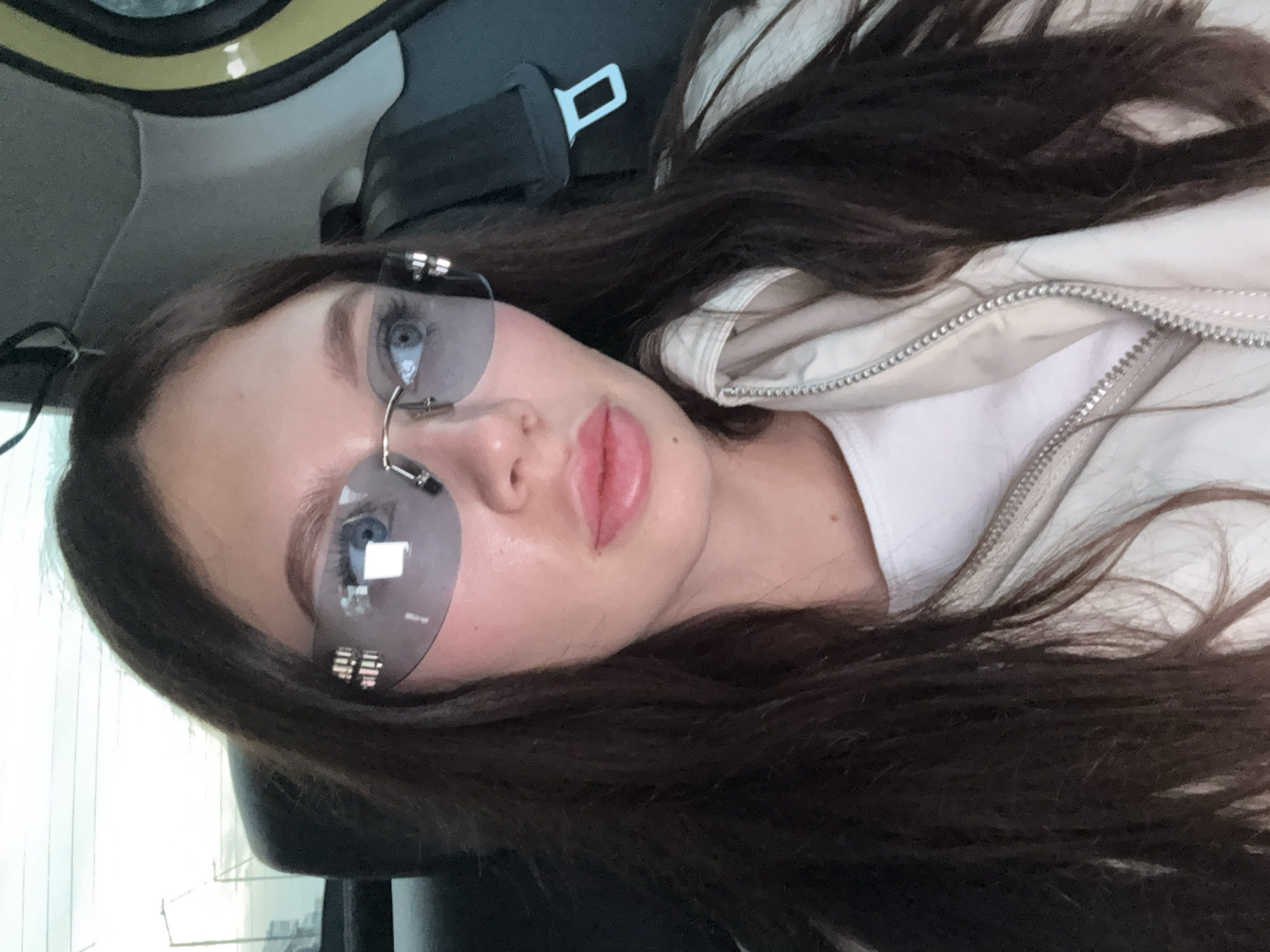 The image depicts a young woman with long, dark hair, wearing sunglasses and a light-colored jacket. She is inside a vehicle, likely a car, judging by the presence of a seatbelt and headrest. The location is possibly Agios Dimitrios, Greece, although this cannot be determined from the image. There are no actions or interactions apparent in the image. The environment appears to be the interior of a vehicle, with a glimpse of the exterior visible through the car window.