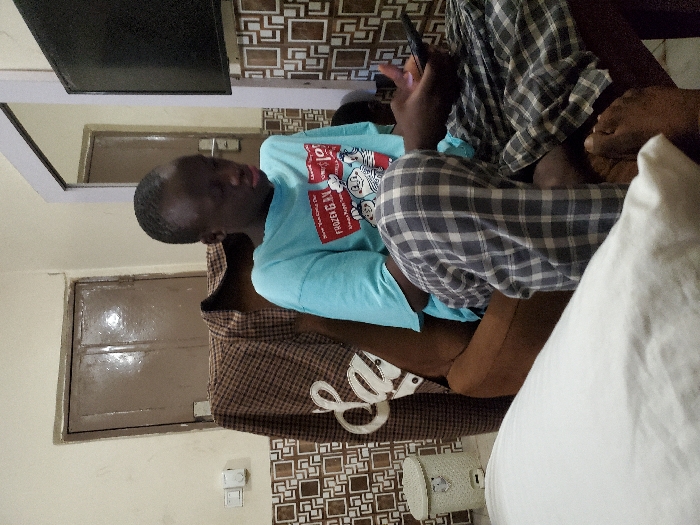 A person in a light blue shirt sits next to another person in a plaid shirt, who is holding a phone. They're sitting on a patterned chair or couch next to a white pillow. The room has patterned tiles and tan walls with a small window and a TV mounted on the wall. A small fan is visible near the bottom of the frame.