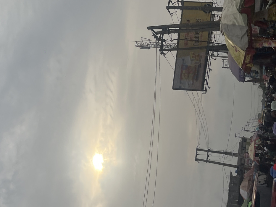 An outdoor scene presents a cloudy sky with the sun visible. Power lines stretch across the frame, converging with utility poles and a billboard structure bearing advertisements, including a possible food product. Below, a crowded market scene unfolds, with various vendors and indistinct figures merging under an array of umbrellas and makeshift shelters, hinting at a busy commercial area.