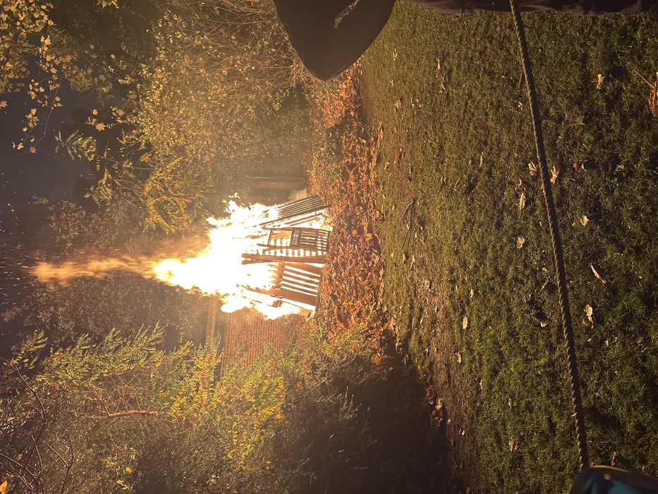 The image depicts a nighttime scene in an urban green space within the City of London, United Kingdom. A large bonfire, composed primarily of wooden pallets, is actively burning, emitting tall flames and incandescent embers. The bonfire rests on a substantial bed of dry, autumnal leaves, which also cover the immediate ground around the fire. Surrounding the bonfire are dense trees and bushes, many displaying yellow and orange autumnal foliage, illuminated by the firelight. Behind the vegetation and bonfire, a brick wall is partially visible, and in the distant background against the dark sky, the silhouettes of multiple tall, urban buildings are discernible. In the foreground, a section of green grass with scattered fallen leaves is visible. A thick, dark rope or chain runs horizontally across the lower part of the frame, serving as a spectator barrier. To the far right, a partial view of a person's dark-clad shoulder and upper arm is visible, positioned behind this barrier. The scene suggests an organized outdoor event, possibly a Bonfire Night celebration, during the autumn season.