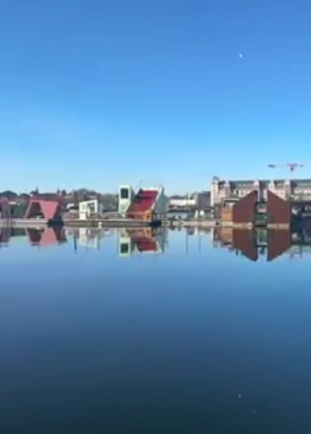 The video presents a serene view of a waterfront area on a clear, sunny day. The water is calm, reflecting the architecture and sky above. On the opposite shore, there are colorful, geometrically designed structures, some resembling small houses or buildings. Further to the left, a large cruise ship is docked, indicating a port city. The sky is a brilliant, cloudless blue. The overall impression is one of tranquility and modern urban design integrated with the natural environment.
