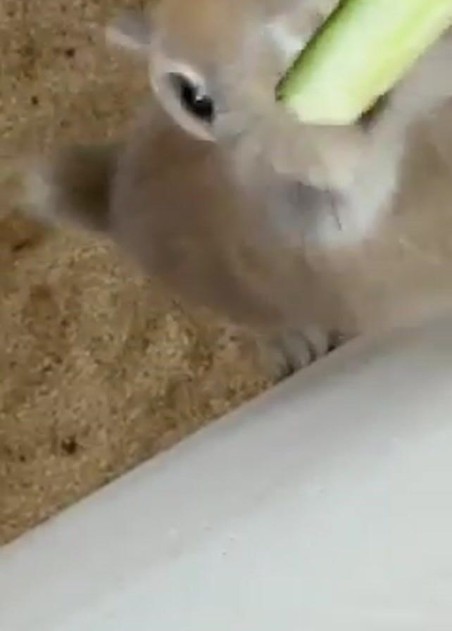 A tan rabbit with white markings on its chest is eating a piece of cucumber. The rabbit is inside an enclosure with a sand substrate and a white wall. Another rabbit, black and white in color, appears briefly in the frame at the top right corner.