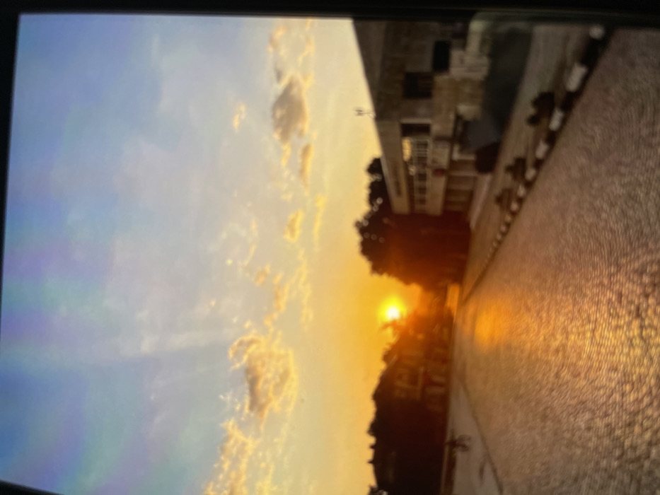 The image depicts an outdoor scene in Cherven Bryag, Bulgaria, during sunset. The sky transitions from a light blue at the top to vibrant orange and yellow near the horizon, populated by scattered, small cumulus clouds. The sun, a bright orange orb, is positioned low on the left side of the frame, partially obscured by dark tree and building silhouettes. Intense sunlight reflects off the foreground's paved surface, which appears to be cobblestones or pavers on a street or plaza, creating a strong orange glow. On the far left, a blurred human figure on a bicycle is discernible, moving away from the viewer. To the right, a light-colored, multi-story building with multiple windows and a flat roof is visible. Along the right edge of the paved area, a dark barrier or curb features intermittent black and white striped elements. The overall scene is characterized by significant blur, consistent with motion or focus issues, and a dominant warm color palette from the setting sun.