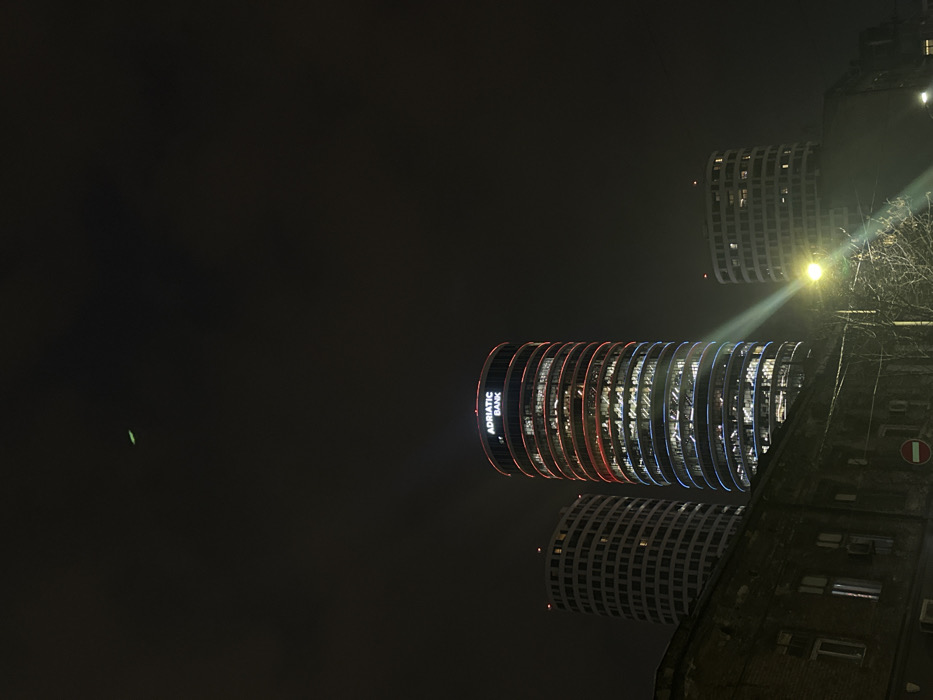 Three cylindrical buildings are visible against a dark night sky. The central building displays the illuminated name "ADRIATIC BANK" in vertical text, marked by red and blue lights that encircle the structure. Above and below this building, are identical structures with white lights. A bright light source appears near the top building, possibly a streetlight or floodlight. A corner of a darker, taller building is seen on the right side of the frame, partially obscuring the cylindrical building below. A small green light is present in the upper-left section of the sky.