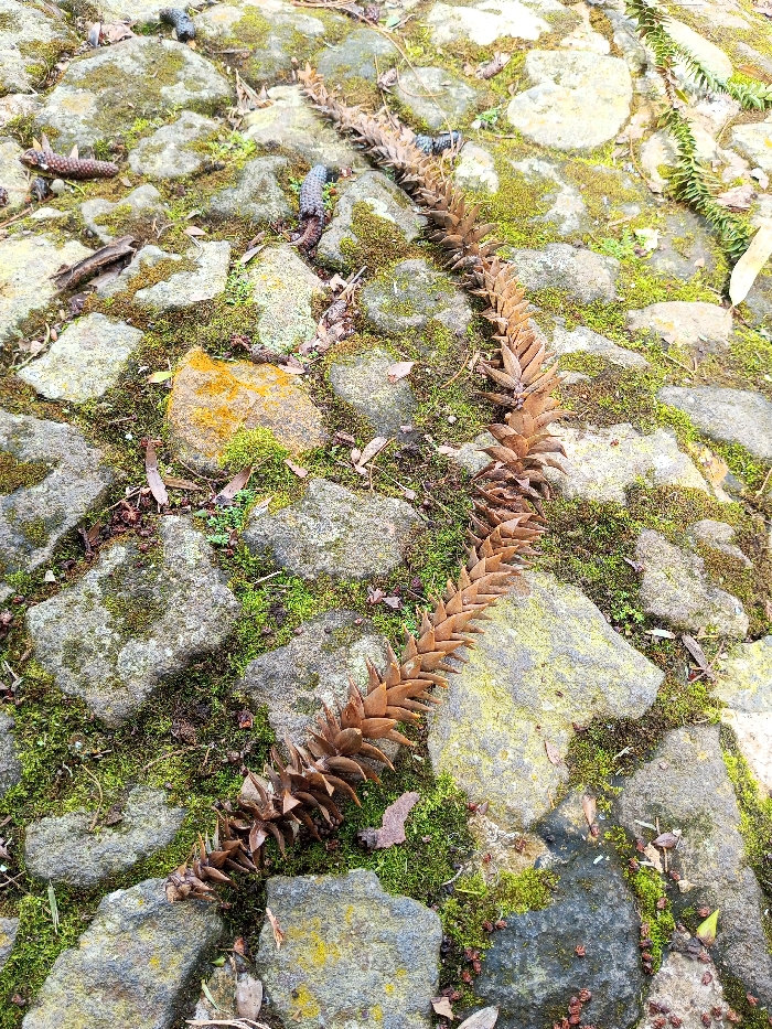 - "A dry, segmented pine cone stretches across a mossy stone path" by FM-AX1Wz1, licensed under CC BY 4.0