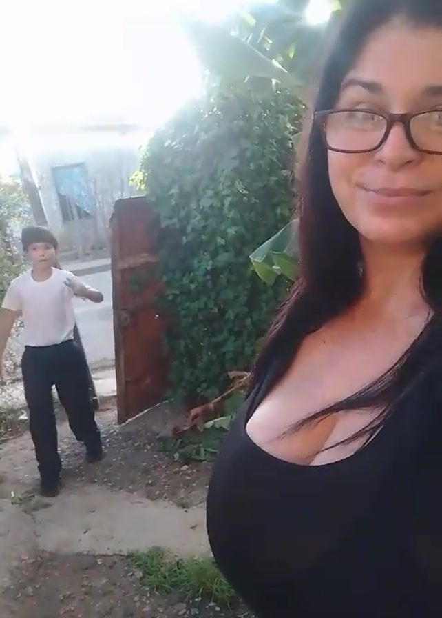 A woman with glasses and long dark hair is taking a selfie. She is wearing a black tank top. Behind her, a boy in a white shirt and black pants walks toward the camera and makes a peace sign. They are standing on a cement path outdoors, with a gate, plants, and a building visible in the background. The sunlight is bright.
