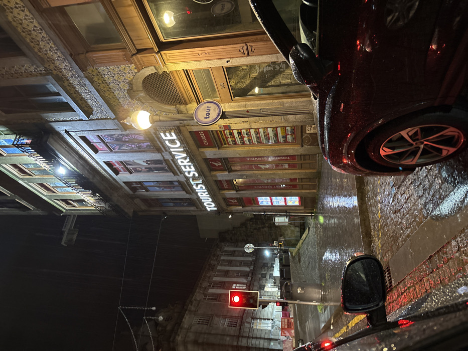 A nighttime street scene from inside a car. The view is tilted; the building facade of "Tourist Service" is prominent. Reflections indicate a wet surface. A traffic light shows red. Part of a dark car, including a tire, is visible in the upper right. The buildings across the street are vaguely visible.