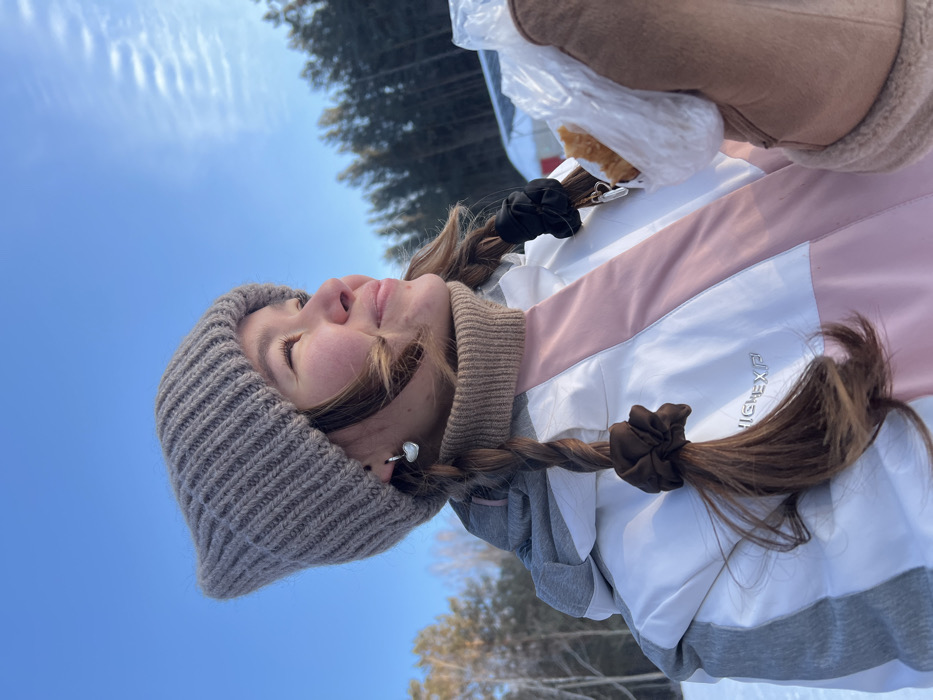 A girl in winter attire, including a beanie and jacket, is angled upward against a sky backdrop. Her hair is styled in braids secured with brown scrunchies. She gazes upward, seemingly closed eyes. A partially visible plastic bag containing a pastry is near her shoulder. Trees are visible in the background. The jacket features white, pink, and gray color blocking with the word "FLEXEXP" printed on it.
