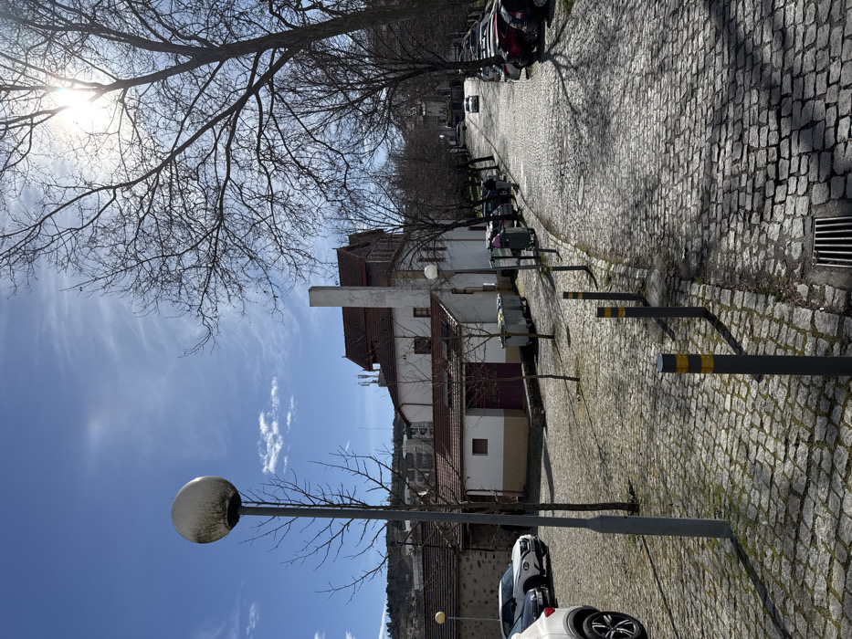 The scene depicts a sunny day on a cobbled street in Bragança, Portugal. The viewpoint is from a slightly elevated position, looking northeast along a gently curving, uphill road. In the immediate foreground, to the left, stands a tall, gray street light post with a dirty, spherical white luminaire. The ground is paved with irregularly shaped cobblestones, exhibiting some moss growth in crevices. To the right of the street light, a series of four gray bollards with yellow reflective bands are arranged along the edge of the pavement, and a rectangular metal storm drain grate is visible in the lower right corner. Long, distinct shadows from trees and bollards are cast across the cobbled surface, indicating a high sun position. On the left, a parking area, also cobbled, features several parked cars. A white SUV, possibly a Nissan Qashqai, is partially visible on the far left. Behind the parking area, two low-rise buildings are present. The closer building has a white upper section and a tan lower section with a dark red stripe at the base, topped with a red tile roof. Behind it, a larger, two-story white building with multiple gabled sections, red tile roofs, and ornate dark wooden eaves features a prominent tall, slender white chimney or stack. Several gray and green industrial waste bins are positioned near these buildings. Cellular antennas are visible on a distant rooftop. The main subject is a cobbled street that curves right and ascends. It is lined on both sides by parked vehicles and bare deciduous trees, which cast extensive shadows. In the mid-distance, a single male pedestrian in dark clothing is walking uphill on the left side of the street. Further up the street, a white car is observed driving uphill. The sky is a clear blue with sparse, wispy cirrus clouds. The sun is high in the sky, positioned to the upper right, causing lens flare and brightly illuminating the scene. Distant hills with sparse vegetation and scattered buildings are visible on the horizon.