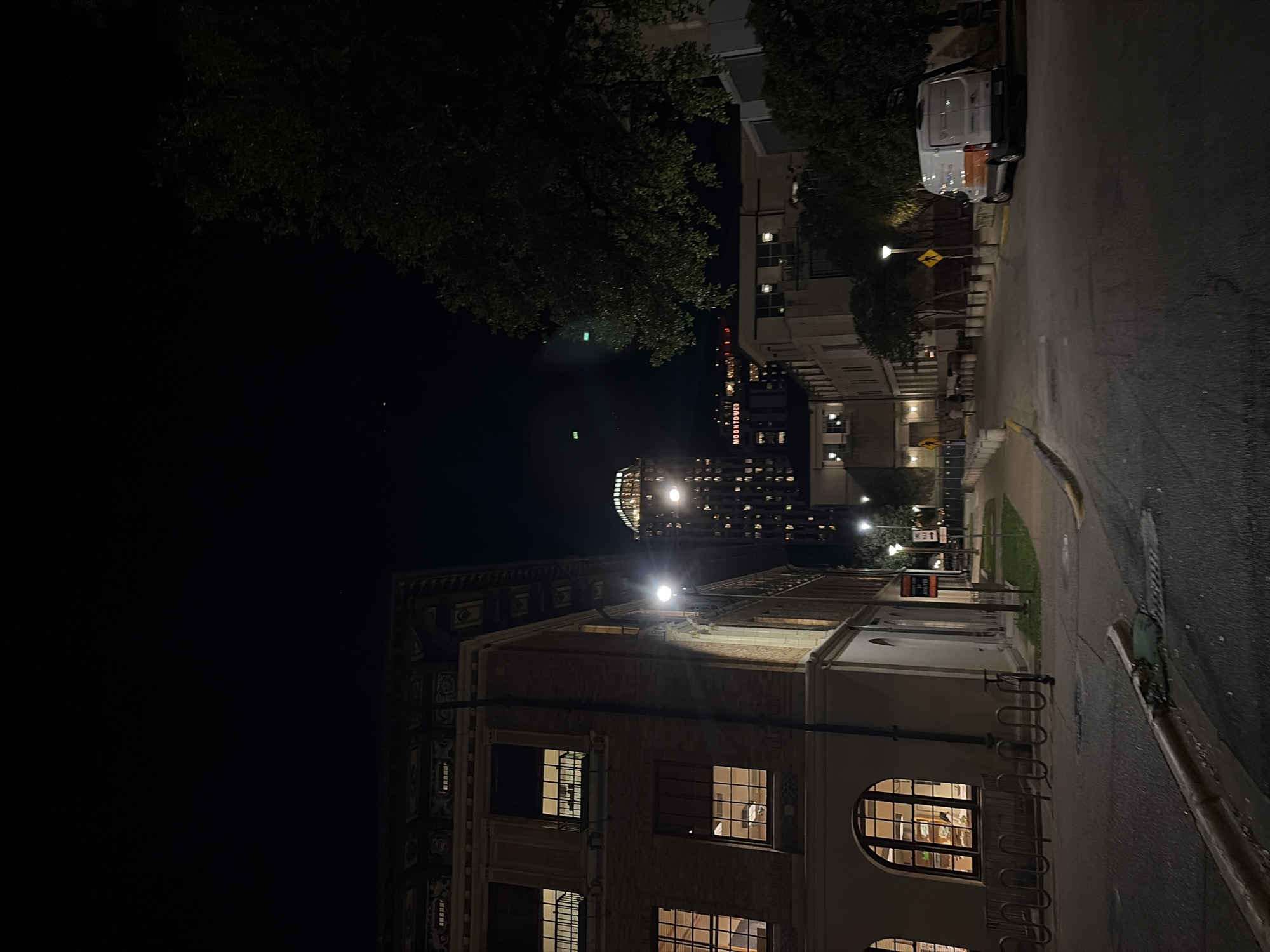 The image, taken at night, depicts a street scene in Austin, Texas, United States. Dominating the frame is a multi-story building with illuminated windows, suggesting a library or academic structure. Above, in the distance, the Frost Bank Tower is visible, recognized by its distinctive architectural crown. A street runs alongside the building, featuring a bike rack and a light pole. Across the street, other buildings and parked vehicles can be seen under the streetlights. Trees line the street, and the overall environment is dimly lit with an urban aesthetic.