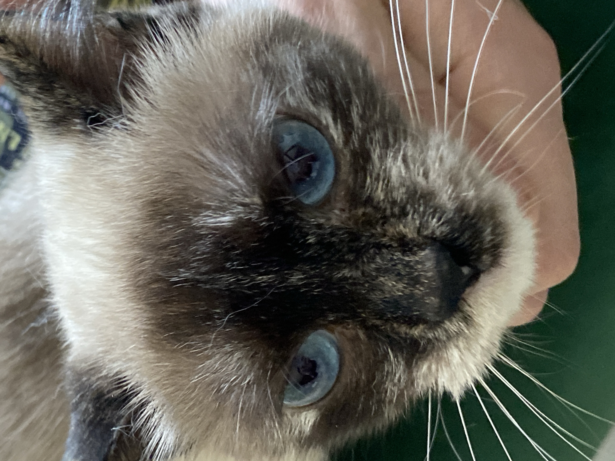 A close-up, slightly tilted view focuses on the head of a Siamese cat. The cat has blue eyes, and its fur is a mix of light and dark shades, particularly around the face and ears. Long, white whiskers extend from the cat's muzzle. A human hand is visible in the background, suggesting the cat is being held. The background is a solid green. The location in the city of Chaikovsky, Russia is unknown.