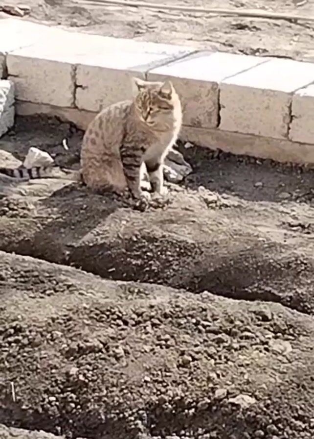 tabby cat sitting on a dirt mound in what appears to be a garden or construction area. The cat is light brown with dark stripes and is positioned near a low brick wall made of rectangular blocks. The dirt mound has parallel furrows running across it. The cat initially sits facing forward and then turns to groom its side. The background is blurry, suggesting the focus is on the cat. The overall lighting indicates it is daytime. A human voice says, “Kitty, kitty”.