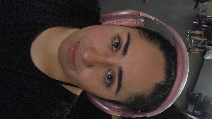 A young woman with brown eyes and dark hair wears pink headphones. She is wearing a black shirt. The background appears to be a gym, with weight equipment visible. The lighting is somewhat dim, and the image has been rotated slightly. Her gaze is directed at the camera.