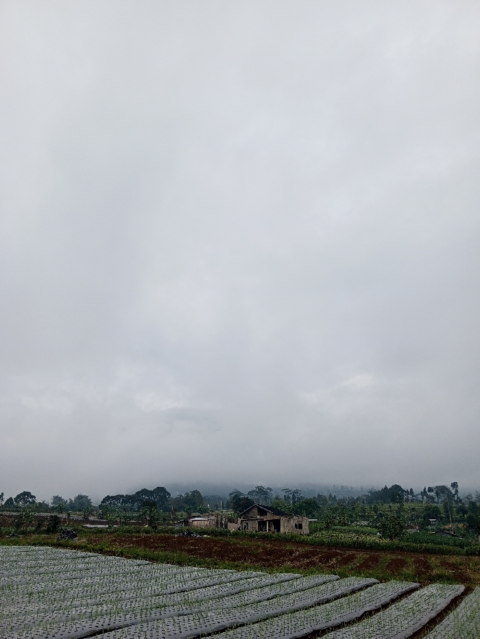 A vast, overcast sky dominates the scene, shrouding a landscape of agricultural fields in soft, diffused light. Rows of crops stretch out in the foreground, their textures contrasting with the soil. In the distance, a derelict structure stands amidst trees, partially obscured by mist clinging to the hills. The overall atmosphere is one of quiet desolation, the muted color palette emphasizing the somber mood of the scene.