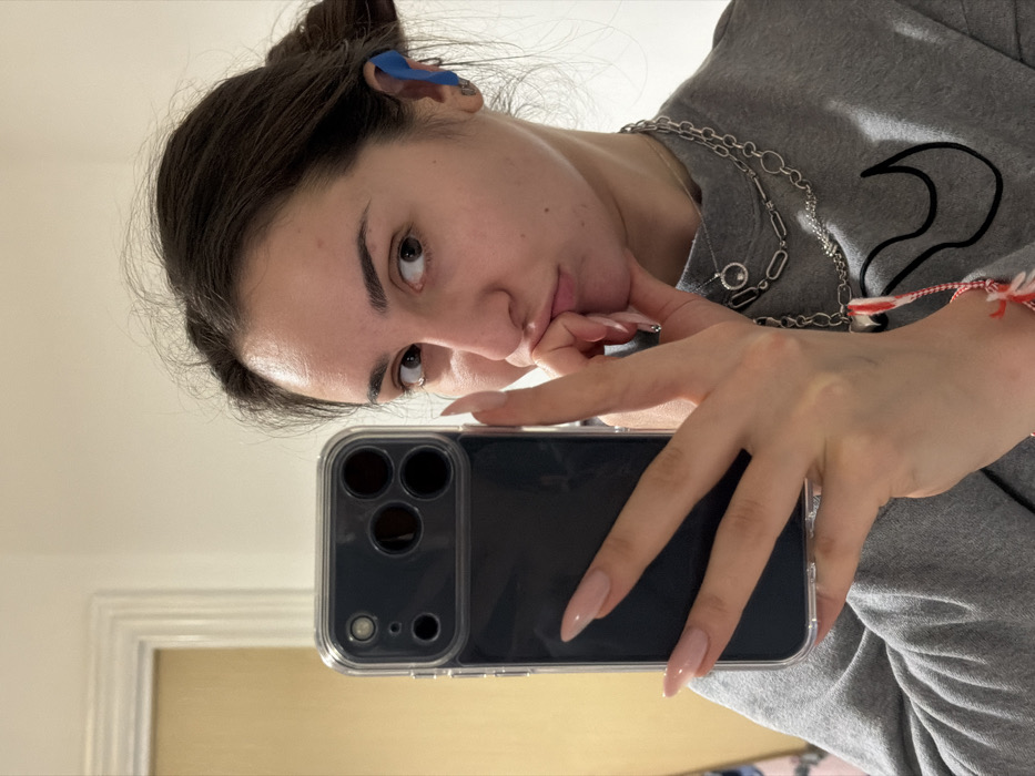 The image presents a female adult taking a mirror selfie indoors. She has dark brown hair, pulled back, and a blue ear clip on her right ear. Her left hand, featuring long, light pink manicured nails, touches her chin and mouth, forming a pouting expression. Her right hand holds a dark-colored smartphone, likely an iPhone 14 or 15 Pro model in a clear case, reflecting its triple-lens camera array. She wears a grey long-sleeved top, two silver-toned necklaces (one with a clear-stoned circular pendant, another a multi-layered chain), and a red and white braided string bracelet on her left wrist. The background, visible in the mirror, consists of a light-colored wall and a portion of a light-colored doorframe with a darker door. No specific visual information in the image confirms the location as Warrington, United Kingdom.