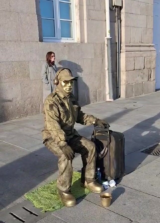 A street performer painted in metallic camouflage sits in a floating pose on the sidewalk with a suitcase, headphones, and a donation cup