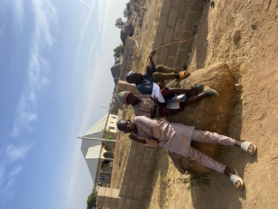Three young boys perch atop a boulder in a sunlit, arid landscape. The first boy, clad in a pink outfit and sandals, reclines at the bottom, his legs outstretched. The second boy wears a head covering, and the third, at the top, holds a stick. All appear to be studying or engaged in a quiet activity. A building with a corrugated roof stands in the background, adjacent to an unfinished brick wall. The sky is clear and blue.