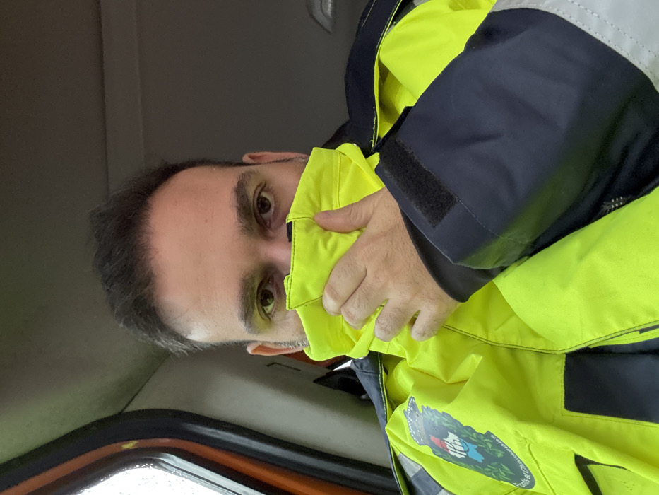 A male individual is depicted from the chest up, situated inside a vehicle. He is wearing a fluorescent yellow/lime green and dark blue two-tone jacket, which features the emblem of the "Corps Grand-Ducal d'Incendie et de Secours" (CGDIS) on the left side. His right hand is holding the jacket's collar up, obscuring his mouth and nose. His dark eyes and forehead are visible, looking directly at the viewer. The interior of the vehicle is dimly lit, with an orange-colored panel visible on the left and a window showing a blurred exterior with possible precipitation. The scene is located in Grevenmacher, Luxembourg.
