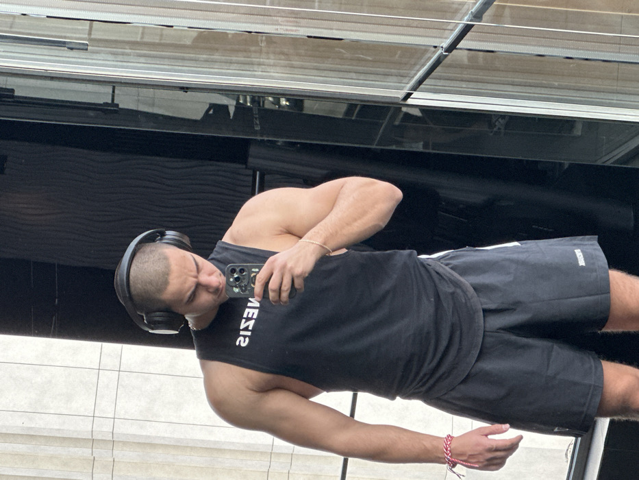 A male individual with a muscular physique and a buzz-cut hairstyle is depicted indoors, taking a mirror selfie