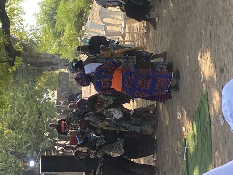 The image displays an outdoor social gathering in Egbu, Nigeria, during daylight
