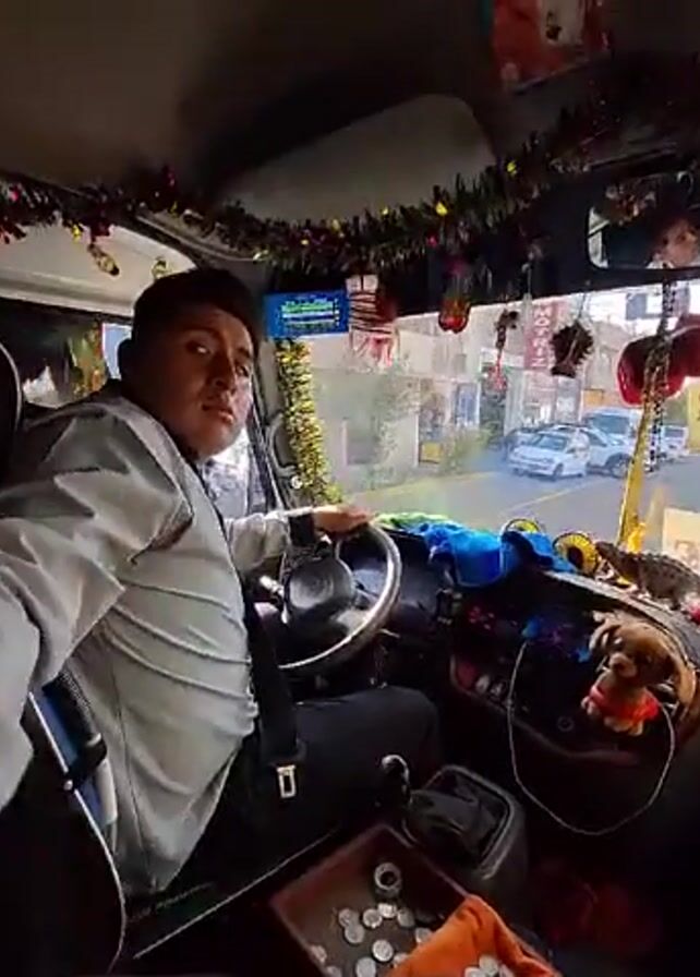 The scene shows the inside of a bus cab, the driver is sitting behind the wheel. He is wearing a gray jacket over a black shirt and a tie. He has dark hair and a mustache. The bus interior is decorated with Christmas decorations and trinkets, including a plush dog on the dashboard. The driver appears to be putting the bus in gear. A small, flat container of coins sits next to the gear shift. Through the windshield, there are other cars, buildings, and signs. The overall lighting is slightly diffused, suggesting an overcast day.