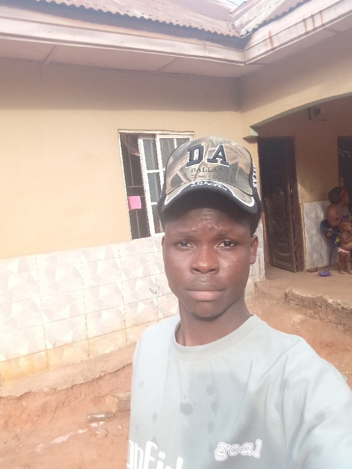 A young man in a "Dallas" baseball cap and a light-colored T-shirt stands outside a beige building. A window with a white frame is to his left. In the background, an open doorway reveals two figures, a woman and a child. The ground in front of the building appears to be dirt and stone. The roof of the building is visible at the top of the frame.