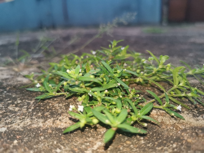 Close-up ground-level shot reveals a patch of sprawling green plants with small, lance-shaped leaves. Tiny white flowers are scattered amongst the foliage. The plants grow on a rough, mottled concrete surface. The background blurs into indistinct shades of blue and brown, suggesting a wall or building. The lighting emphasizes textures, with shadows indicating depth and highlighting the contours of the plants and the concrete.