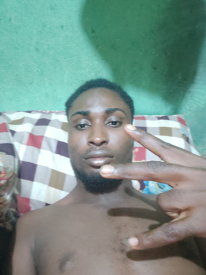 A shirtless man with dark skin, a beard, and short black hair lies on a patterned pillow. He is making a peace sign with his right hand. The wall behind him is green. The lighting is uneven, casting a shadow on the wall and the man's chest.