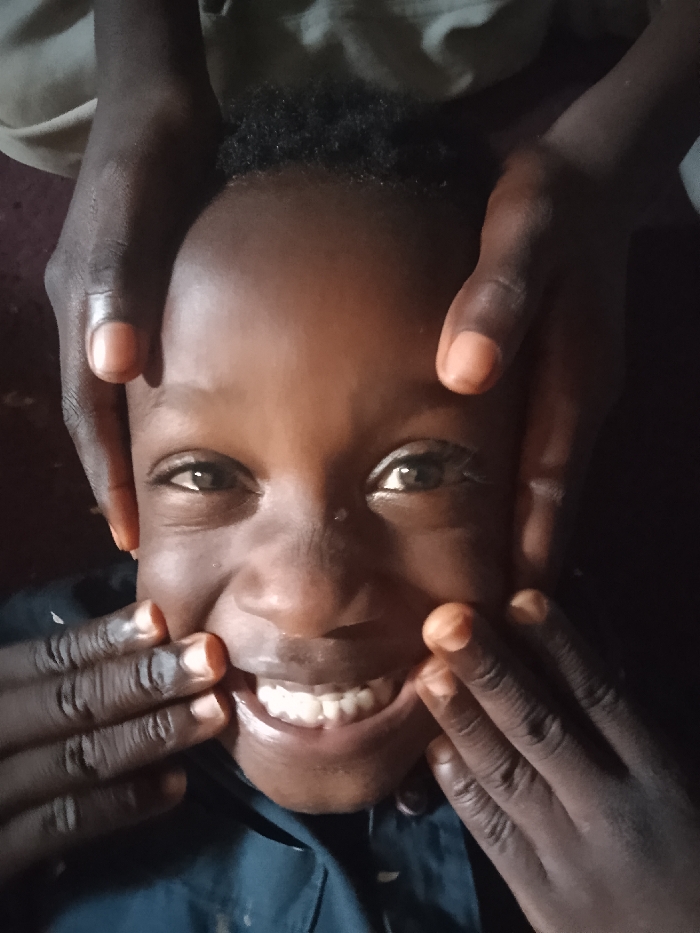 A close-up, vertical photograph captures a young individual, likely a child, with dark skin and short, dark, curly hair, smiling broadly. The subject's light-colored irises are directed towards the viewer. Four hands with dark skin and light-colored fingernails are actively engaged with the subject's face. Two hands are positioned on the subject's temples, and two other hands are pulling the corners of the subject's mouth outwards, emphasizing the smile and revealing upper and lower teeth. The subject wears a dark, possibly blue or black, collared garment around the neck and shoulders. A light-colored fabric is partially visible in the upper background, behind the subject's head, suggesting the presence of another individual. The immediate background is dark and out of focus. The scene takes place in the city of Unknown, Unknown.