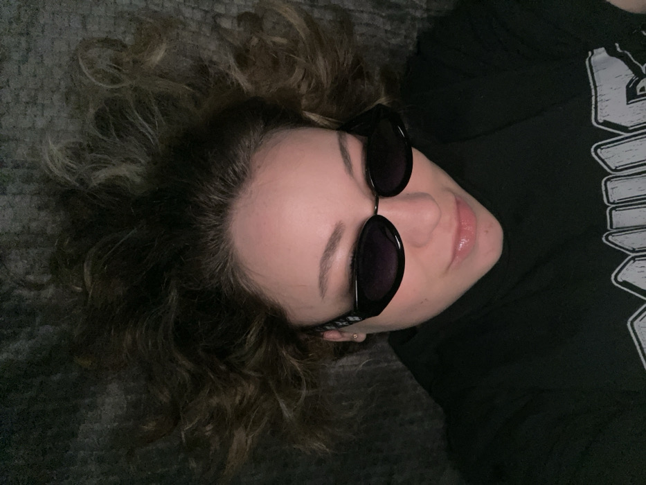 A female subject is depicted lying supine, viewed from above. Her wavy, dark brown hair with lighter highlights is fanned out against a dark, textured surface. She wears dark, oval-shaped sunglasses that obscure her eyes. Her lips are slightly parted, exhibiting a glossy appearance. She is wearing a black crew-neck t-shirt with a white graphic design partially visible on the chest. A small gold stud earring is visible on her left earlobe. The specific location in the city of Bar, Montenegro, cannot be determined from the visual evidence within the image.