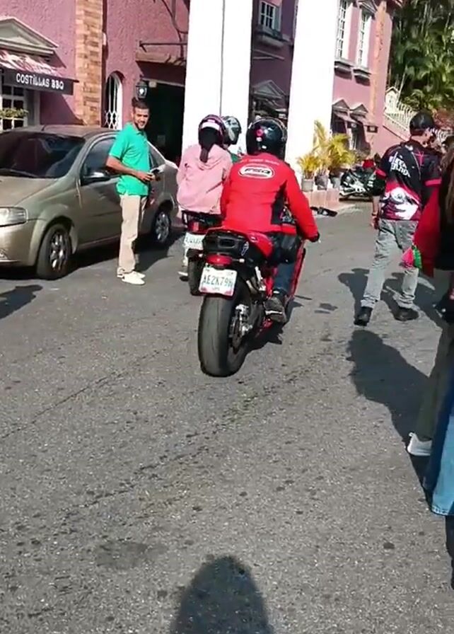 group of people and motorcycles on a street. The motorcyclists are wearing helmets and riding red motorcycles with license plates that read “AE2K79N”. Some people are standing and walking, and others are on motorcycles. There is a pink building with white columns in the background, as well as cars and other buildings. Someone is taking pictures with a phone. Some people are wearing masks.