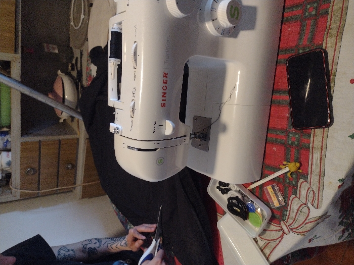 The scene depicts an indoor setting, likely a domestic space, featuring an individual engaged in a sewing task. **Environment:** In the background, a light-colored wall transitions to a wooden cabinet with multiple drawers and open shelves holding various domestic items, including ceramic dishes (a green bowl, a white-and-blue patterned dish, a lidded pink-and-white pot). A metallic pole extends diagonally across the background. The foreground features a table draped with a red, green, and white plaid tablecloth adorned with white bows, suggestive of a festive theme. **Subjects and Objects:** A white Singer Tradition sewing machine occupies the right side of the table, loaded with a black spool of thread and threaded with black material. Adjacent to the machine, a white plastic container is open, revealing various sewing notions such as black cord, colorful fabric pieces, and other small items. A small, transparent plastic box containing multiple spools of thread is positioned nearby. A decorative yellow and white object, resembling a miniature sword, lies on the tablecloth. A black smartphone with a red-edged case rests face down on the tablecloth in the lower right, exhibiting a linear light reflection. **People and Actions:** A person, partially visible on the left, wears a black short-sleeved shirt. Their left forearm is extensively tattooed with multiple distinct designs. The individual is actively utilizing blue-handled scissors to cut a piece of dark, possibly black, fabric. **Location:** No visual cues within the image confirm its location in Ushuaia, Argentina. The details provided are consistent with a general indoor domestic environment.