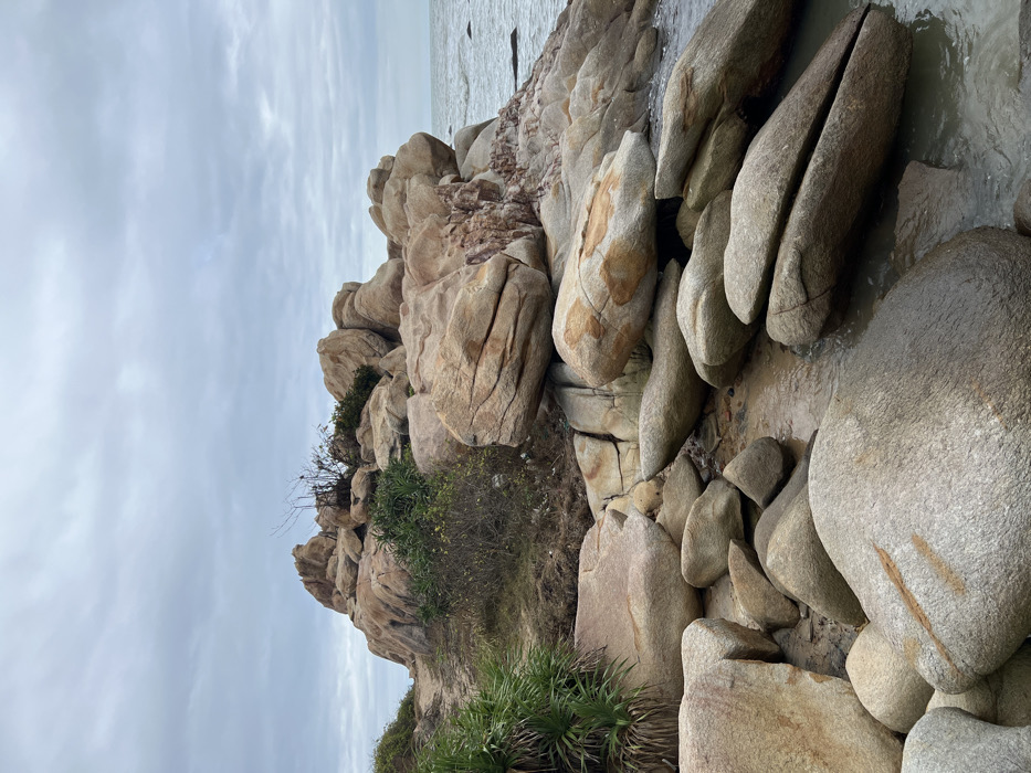 A rocky outcrop dominates the foreground, composed of various-sized boulders stacked upon one another. Patches of sparse vegetation, including grasses and shrubs, cling to the rocks. The sea's edge can be seen to the right, with waves gently lapping against the base of the rocks. Above the rocks, a hazy sky blankets the scene. The overall tone is muted, with earthy browns and grays dominating the palette.