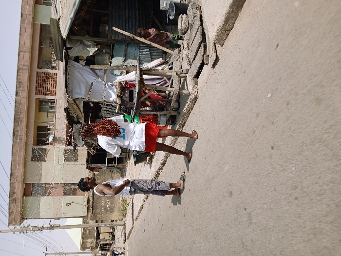 The image portrays a street scene in Mumbwa, Zambia, under clear daylight conditions. An asphalt road, displaying patches of wear, occupies the foreground, bordered on the right by a damaged concrete curb. Three individuals are present on the right side of the road, adjacent to a makeshift commercial structure. The subject on the left is an adult male with dreadlocks, wearing a white sleeveless top, grey cargo shorts, and sandals; he stands with hands on hips, oriented towards the right. Centrally positioned, an adult female with reddish-brown dreadlocks is observed from behind, wearing a white t-shirt with a blue "15" on the back and a red skirt; she is barefoot and faces the makeshift structure. A young child, partially visible on the far right, wears a striped top and holds a wooden stick, also oriented towards the right near the structure. This makeshift structure is assembled from corrugated metal sheets, wooden supports, and white fabric, featuring a wooden table, black buckets, and a green crate at its base, with a long wooden pole leaning against it. In the background, a multi-story building with a light-colored facade, balconies, and windows is visible, along with utility poles and overhead wires on the left.