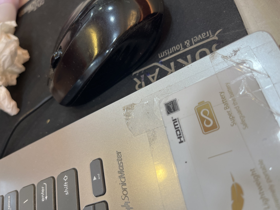 A close-up, top-down view depicts a workstation setup located in Sarouja Municipality, Syria. The left side of the frame is dominated by a silver-colored laptop. Visible keyboard keys include "enter," "shift," and "end" (with an accompanying play symbol). The laptop's palm rest displays the "SonicMaster" logo. A product sticker on the palm rest, partially obscured and secured by clear adhesive tape exhibiting wear, shows "HDMI™" and "ENERGY STAR®" logos. Text on this sticker includes "Super Battery," "Safeguard the battery," and a partially visible "Lightweight" alongside a feather icon. To the right of the laptop, a glossy black wired optical mouse with a visible scroll wheel rests on a dark-colored mousepad. Partially legible text on the mousepad reads "OOKAR Travel & Tourism." In the upper right background, a crumpled white paper tissue is present. The scene is brightly lit, with reflections on the surfaces of the laptop and mouse. No individuals are visible.