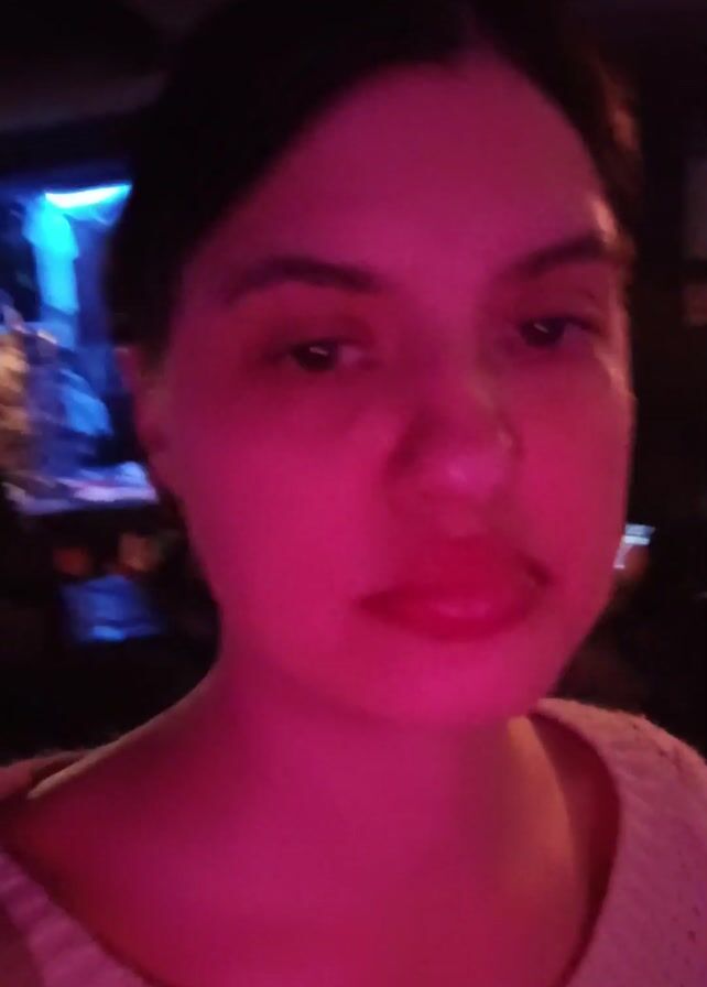 A woman with dark hair pulled back is centered in the frame, looking directly at the camera. She is wearing a light-colored sweater. The lighting in the background shifts through different colors, primarily pink, purple, and blue, suggesting a setting with color-changing lights, possibly a bar or event venue. People and objects are blurred and visible in the background, further indicating a social or public space. The woman's facial expression appears neutral.