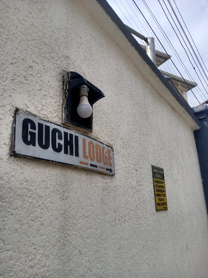 The image depicts an exterior view of a building wall in the city of Unknown, Unknown. The wall is textured with a stucco-like finish and painted a light beige or off-white color. Mounted on the wall, to the left, is a rectangular sign displaying "GUCHI LODGE" in a distressed font; "GUCHI" is in black, and "LODGE" is in orange, accompanied by a right-pointing arrow. Directly above this sign is an enclosed, dark-colored wall-mounted light fixture, appearing weathered, containing a single white LED light bulb. To the right of the "GUCHI LODGE" sign, further down the wall, a smaller, vertical sign with a black background and yellow text is partially visible, indicating a warning or informational message. The top edge of the building wall features a dark coping. Above the wall, a metal downspout or conduit extends upwards, and several overhead utility wires traverse the frame against a light, cloudy sky. No people are visible in the scene.