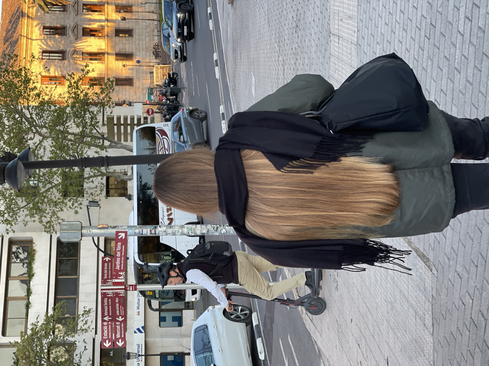 This eye-level, portrait-oriented image shows a street scene in Valencia, Spain, with a woman's long, light brown hair and black scarf dominating the foreground. She is wearing a dark green jacket. Behind her, a man in a white shirt, tan pants, and a black helmet rides an electric scooter along the sidewalk. Street signs are visible, pointing towards "Jardins del Túria", "Torres dels Serrans", "Estació de Nord", and "Mercat d Colom." A white car and a van are parked at the curb. Other cars are visible on the street. A building with multiple windows is in the background, with palm trees casting shadows onto its facade. The scene appears to be bathed in the warm light of the late afternoon.
