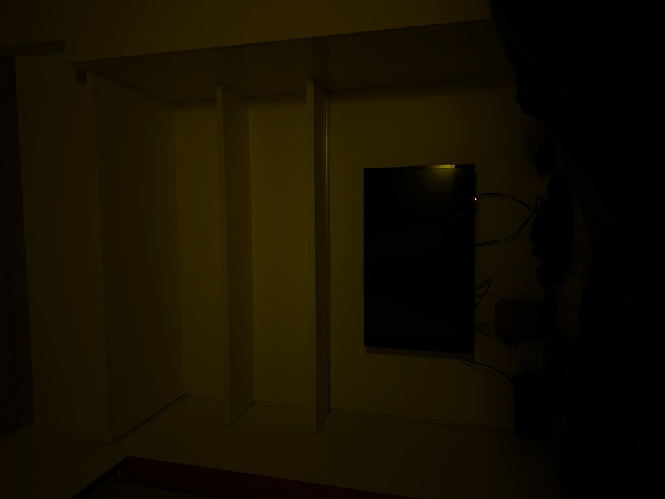 The scene depicts an interior room in the city of Melbourne, Australia, illuminated by low, yellowish light. A dark, flat-screen television is mounted on a light-colored wall. A small red indicator light is active on the bottom edge of the television screen. Above the television, a built-in shelving unit features three empty, light-colored shelves. Below the television, multiple black cables descend to connect various indistinct dark electronic devices resting on a surface. A vertical, reddish object, potentially a gaming console, is discernible among these devices to the lower-left of the television's center. The immediate foreground is obscured by deep shadow. No individuals, active subjects, or discernible actions are present.
