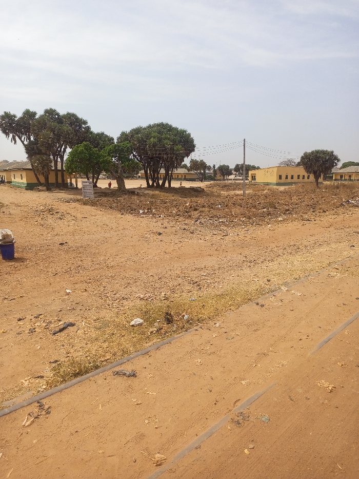 The image depicts an expansive outdoor scene in Sabon Tasha, Nigeria, under a pale, hazy sky