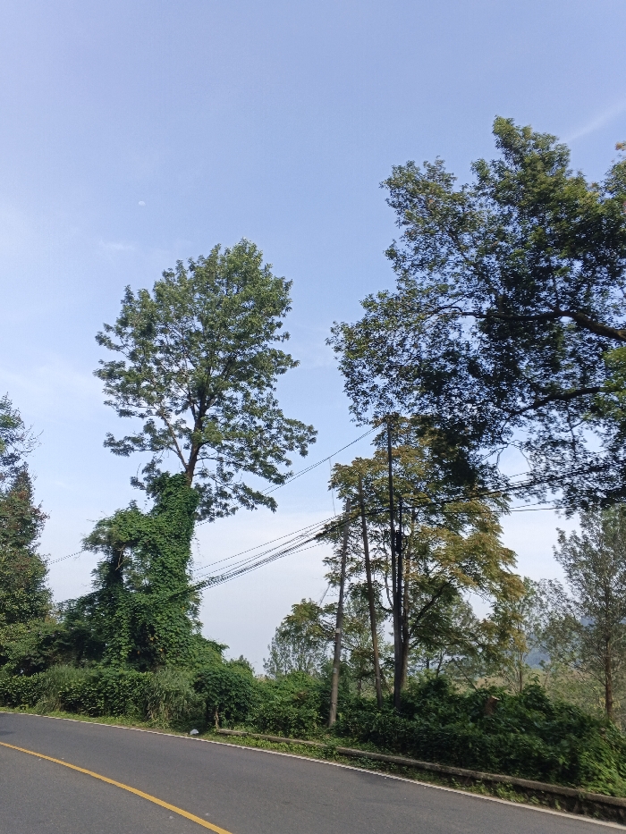 A roadside view showcases lush greenery with trees dominating the scene. One tree, largely covered in vines, stands prominently on the left. Electrical wires stretch across the sky between the trees. The road, marked by a yellow line, curves gently. The sky is a clear blue, with a faint hint of a moon visible. Dense vegetation and foliage fill the spaces below the trees, creating a rich, natural landscape.
